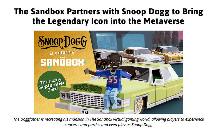 "We are entering into a new age of creative potential that was never possible bound by the laws of the physical world and are excited to help Snoop continue to provide innovative entertainment for his millions of fans all across the globe,” said Alex Livian, Founder of Cultivate Studios, and representative of The Sandbox & Snoop Dogg collaboration.
